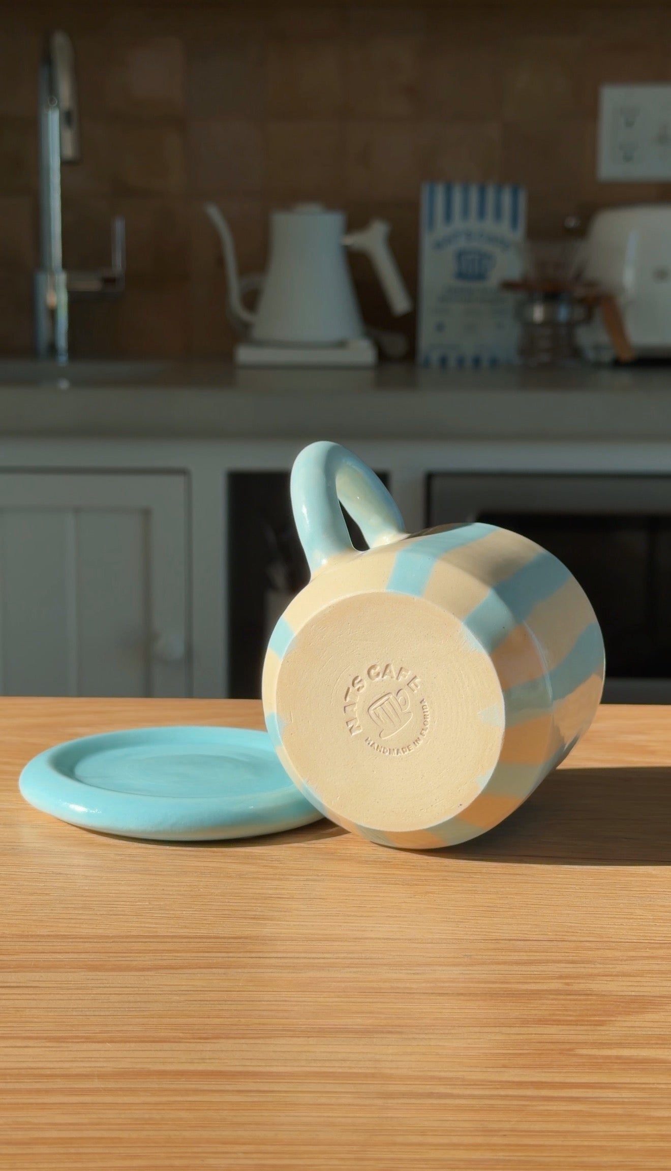 Logos can be intimidating to come up with... they're only meant to be super recognizable and have incredibly deep and profound meaning to you brand. Lucky for us, we just put everything we love into one thing! Blue, stripes, and coffee <3 Now you can enjoy each hot or iced sip you take from our locally handmade mug, and it even comes with a cute food-safe saucer to call home.